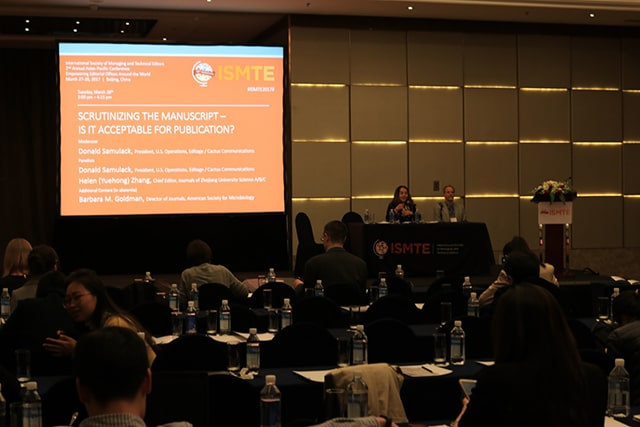Dr. Samulack 同時與浙江大學報期刊主編(SCIENCE A/B and FITEE) Ms. Helen Zhang主持並且簡報其中一場講座「審查論文-是否適合出版?」此講座除了討論解決掠奪性期刊和不道德的出版商所犯的一些不負責任的出版手法,還聚焦於編輯者如何確定作者論文稿件的違規行為,像是出售論文、同儕評審欺詐、剽竊、重複出版、圖像作假、自我引用和其他有違發表道德的違法行為。